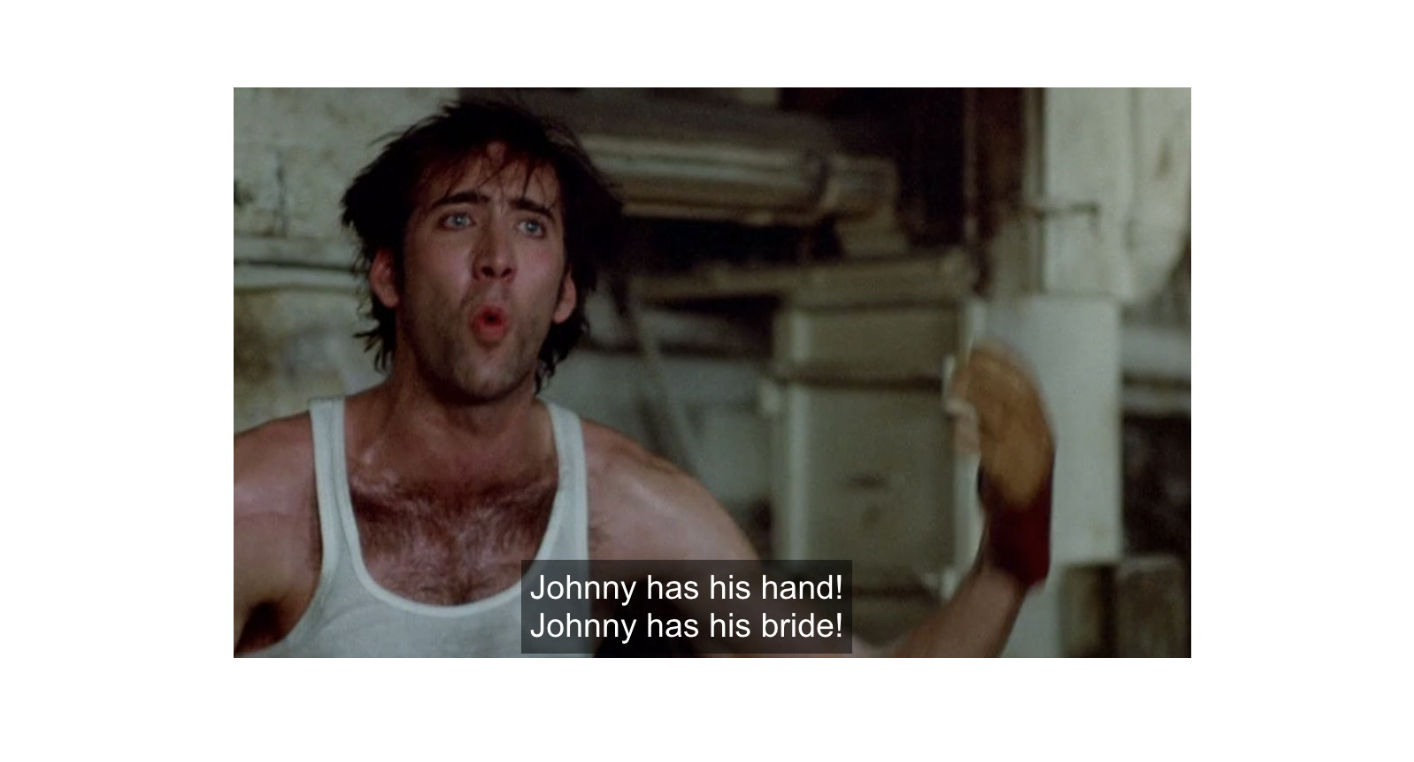 After receiving a phone call that his mother, the family matriarch, is dying, Johnny books a flight to Italy to be at her deathbed. Loretta drives him to the airport and this is when he makes his own request—a condition of sorts, an expression of what Johnny needs in order for their marriage to be blessed. He makes her promise to invite his estranged brother Donny (played by the extraordinary Nicolas Cage) to their wedding. The brothers haven’t spoken in five years. Donny lost his hand in a freak accident in the bakery, which then led him to losing his fiancee: he blames the accident and the loss of his potential happiness on Johnny.