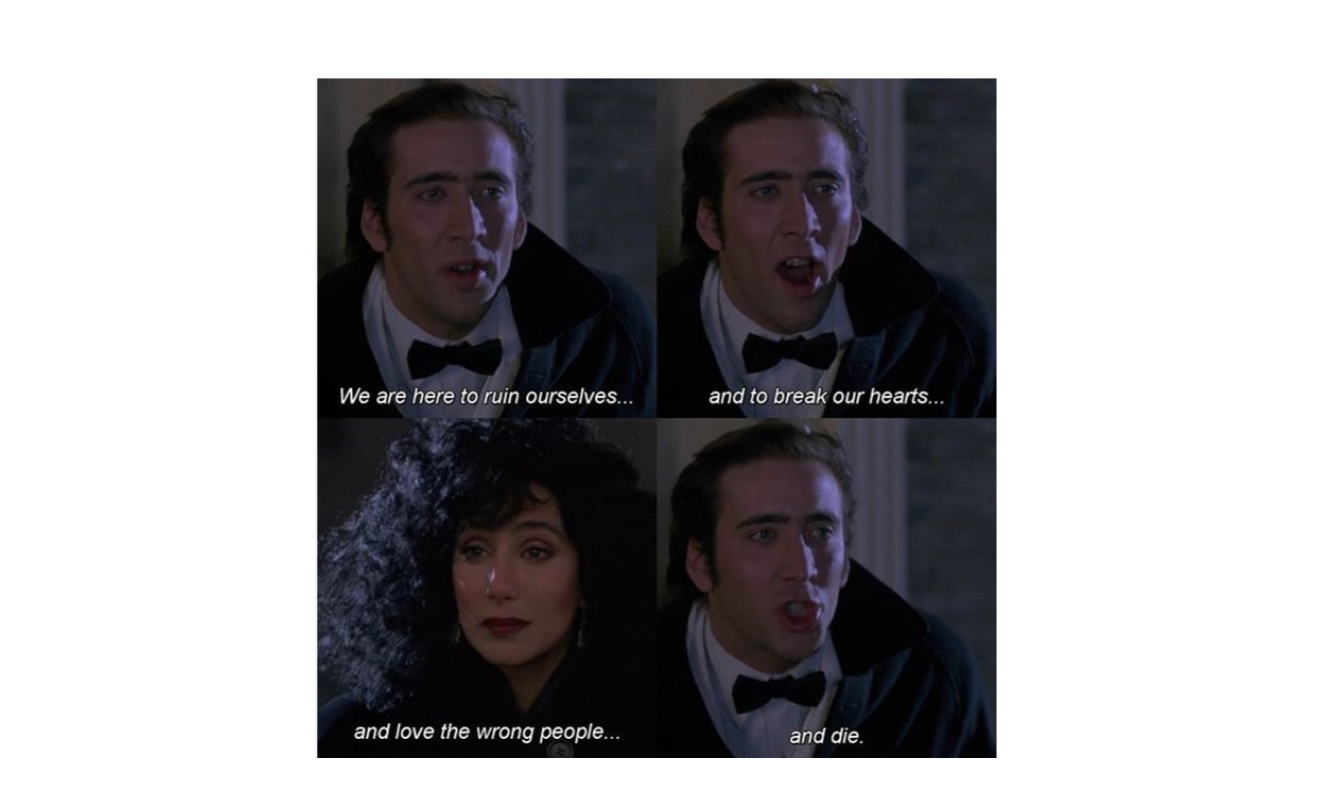 “I learned that my dealer isn’t going to New Orleans for another two weeks,” I said to my friend when she asked what I thought about Carrie. I also avoided her next question. One could say I learned that avoiding questions is preferable to answering them when high-femme is on the table. If I mention this at all, it is because there is a part in Moonstruck that reminds me of what would later be groomed into neoliberal femininity and I left the room while my son, father, and partner watched it because I did not have enough or truly any weed.
