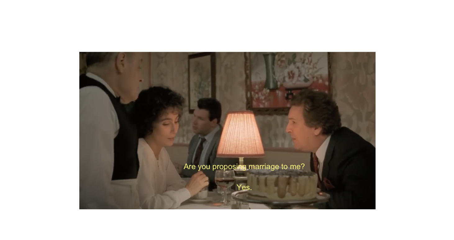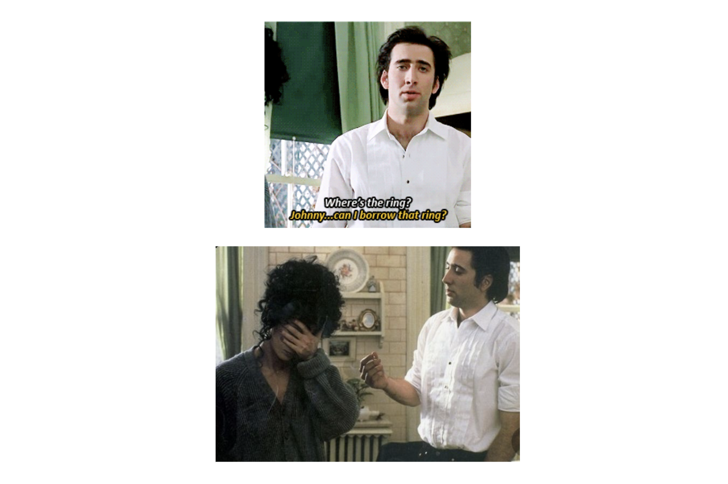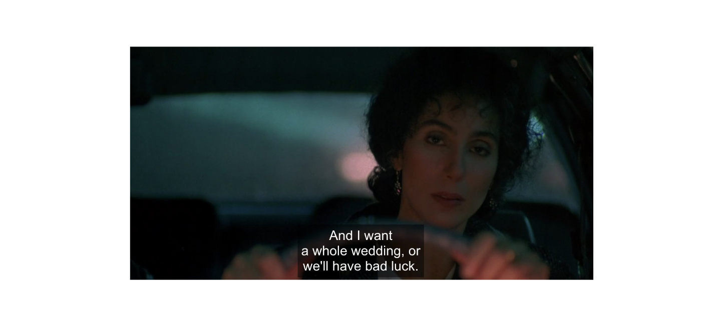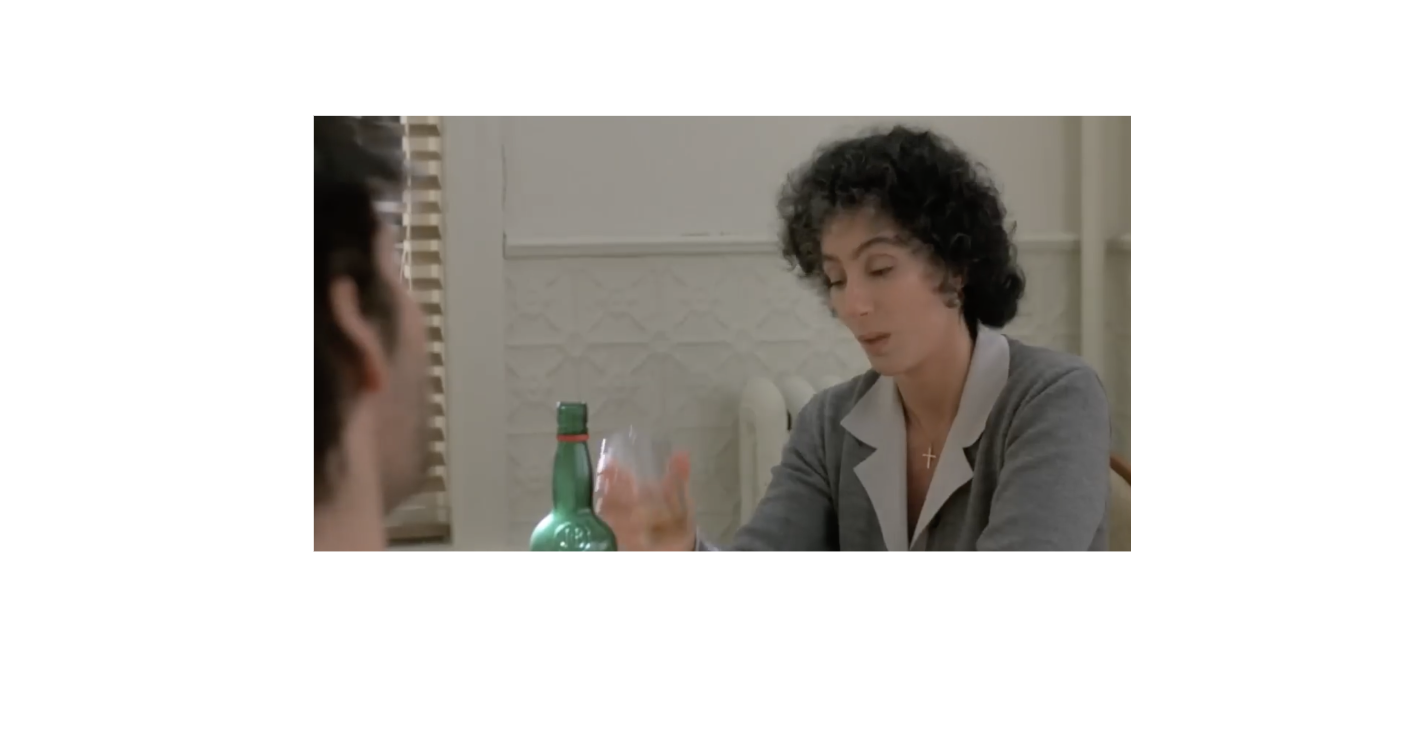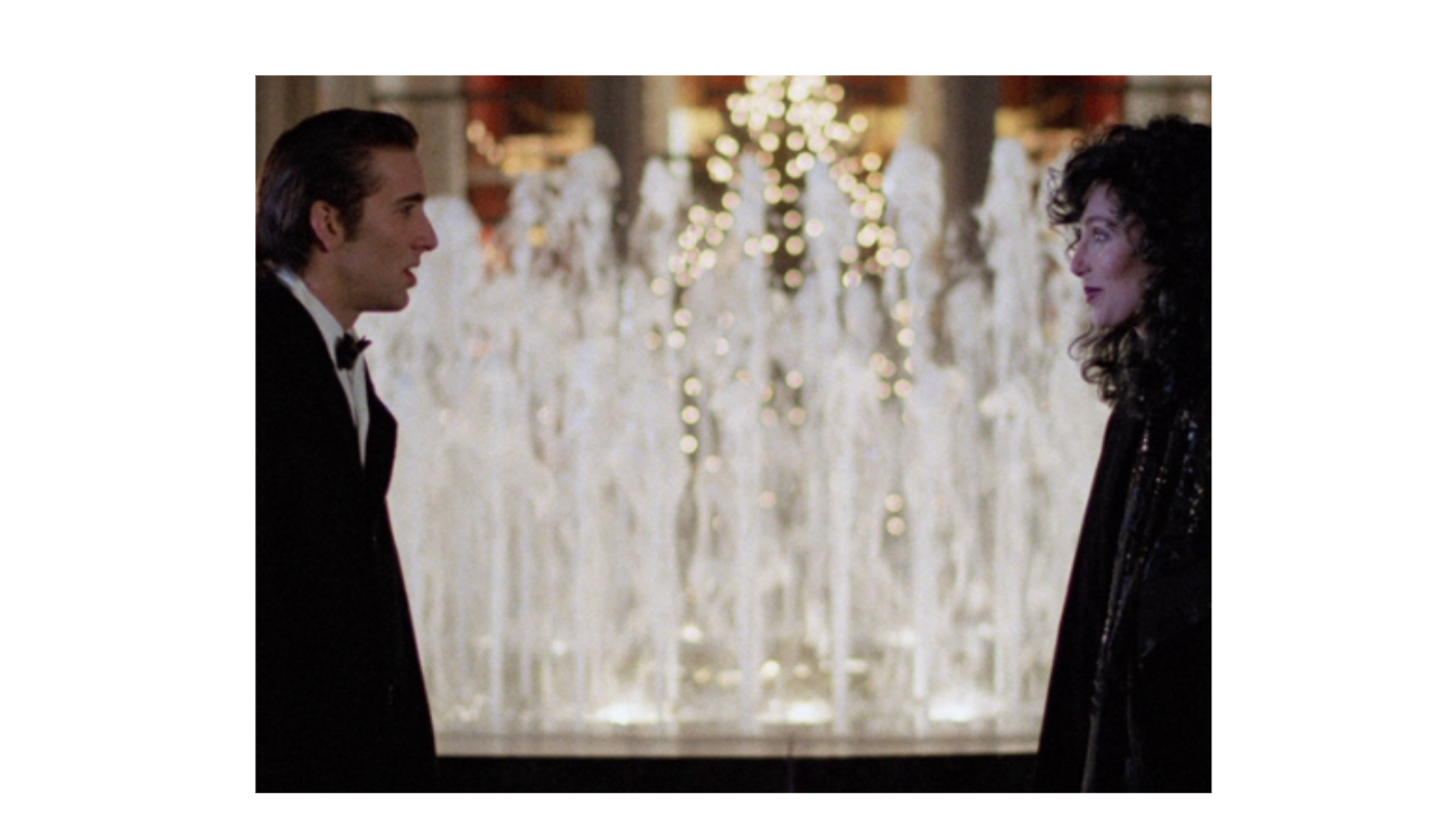 In the opening marriage proposal, Loretta (played by Cher) shares a romantic dinner with her boyfriend, Johnny Cammareri . He asks her to marry him while sitting at the table in the restaurant–but she refuses to consider due to her fear of bad luck. Affectionately, Loretta gives certain conditions for the way in which he asks the question—and all of these conditions are related to her belief that her first husband died because these conditions were not met. So, already, there is a level of 'improvement' involved, and a sort of control that she needs to exert over the situation.