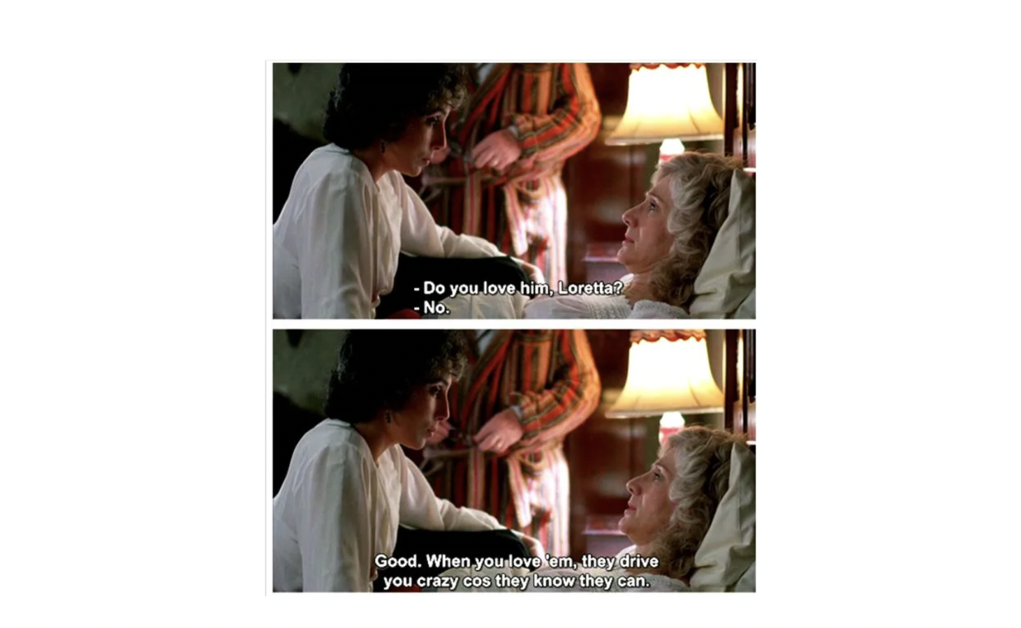 We are thinking about the part of the exchange where Donny yells at Loretta, implicating her an expectation that he forget—-“You want me take my heartache, put it away, and forget?!” Loretta doesn’t respond.
