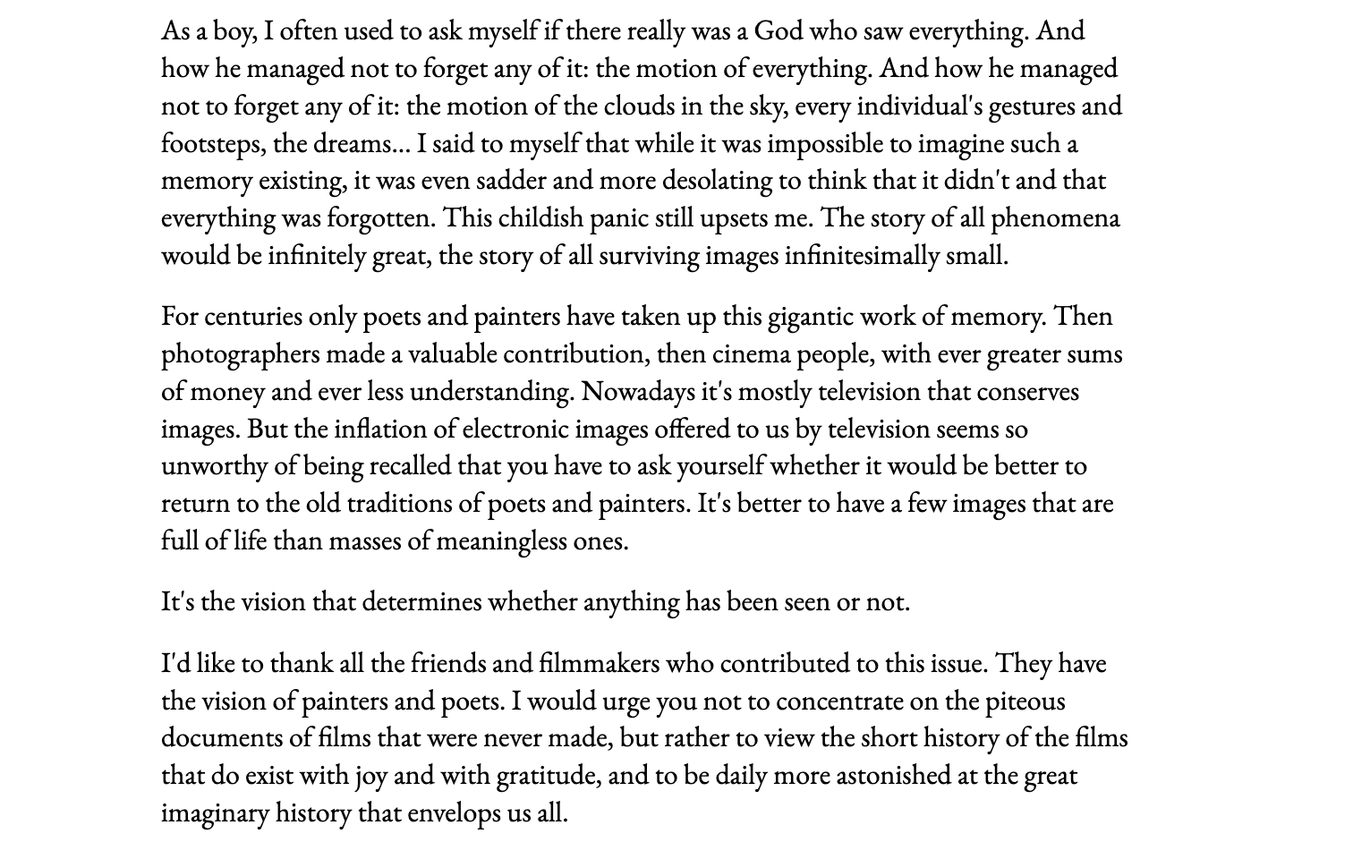 I don't know anything about the way a film is born, nothing about the manner of it, the lying-in, the 'big bang', the first three minutes. Whether the images in those first three minutes are born out of their author's deep desire, or if – in an ontological sense – they merely are what they are. I wake up one morning with my head full of images. I don't know where they come from, or how or why. They recur in the following days and months; I can't do anything about them, and I do nothing to drive them away. I'm happy to contemplate them and I make notes in my mind, which I write down in a book some time.