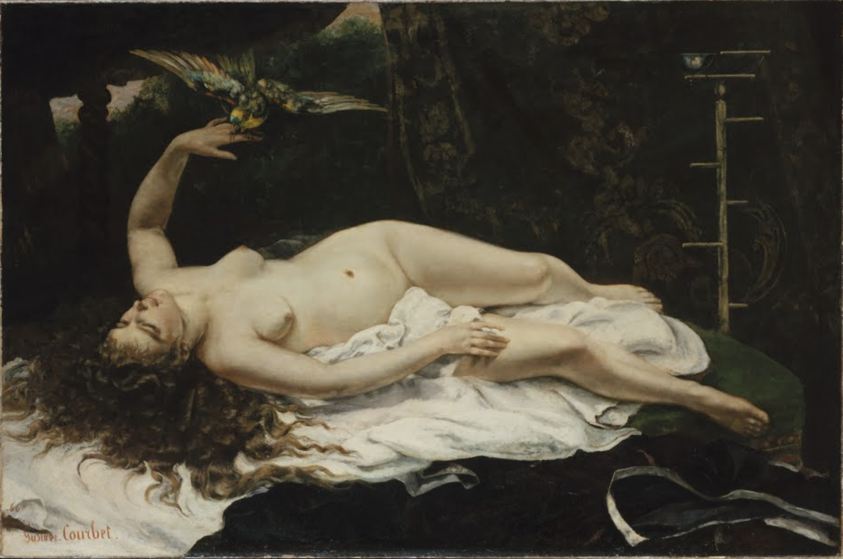 The woman in this painting hides nothing from the parrot. Like Renoir’s woman, her interest is given entirely to the bird on her hand — but the expression is one of fascination rather than disdain. Her fingers are spread open, resembling the gesture of a statue I saw last week in New Orleans: a posture of the hand that beckons winged things. And the parrot complies. In Courbet’s painting, the walls are tent-like, set to sway and curve like the fabrics beneath the nude: the distance between inside and outside is permeable, as illustrated by the slight crack in the wall — with its chlorophyll-warmed greens — that enabled the parrot to enter. Courbet’s parrot is an expected guest who visits and delights the woman. Renoir’s parrot is a caged creature intended to please the residents of the cultivated bourgeois interior. I could riff on this forever . . .