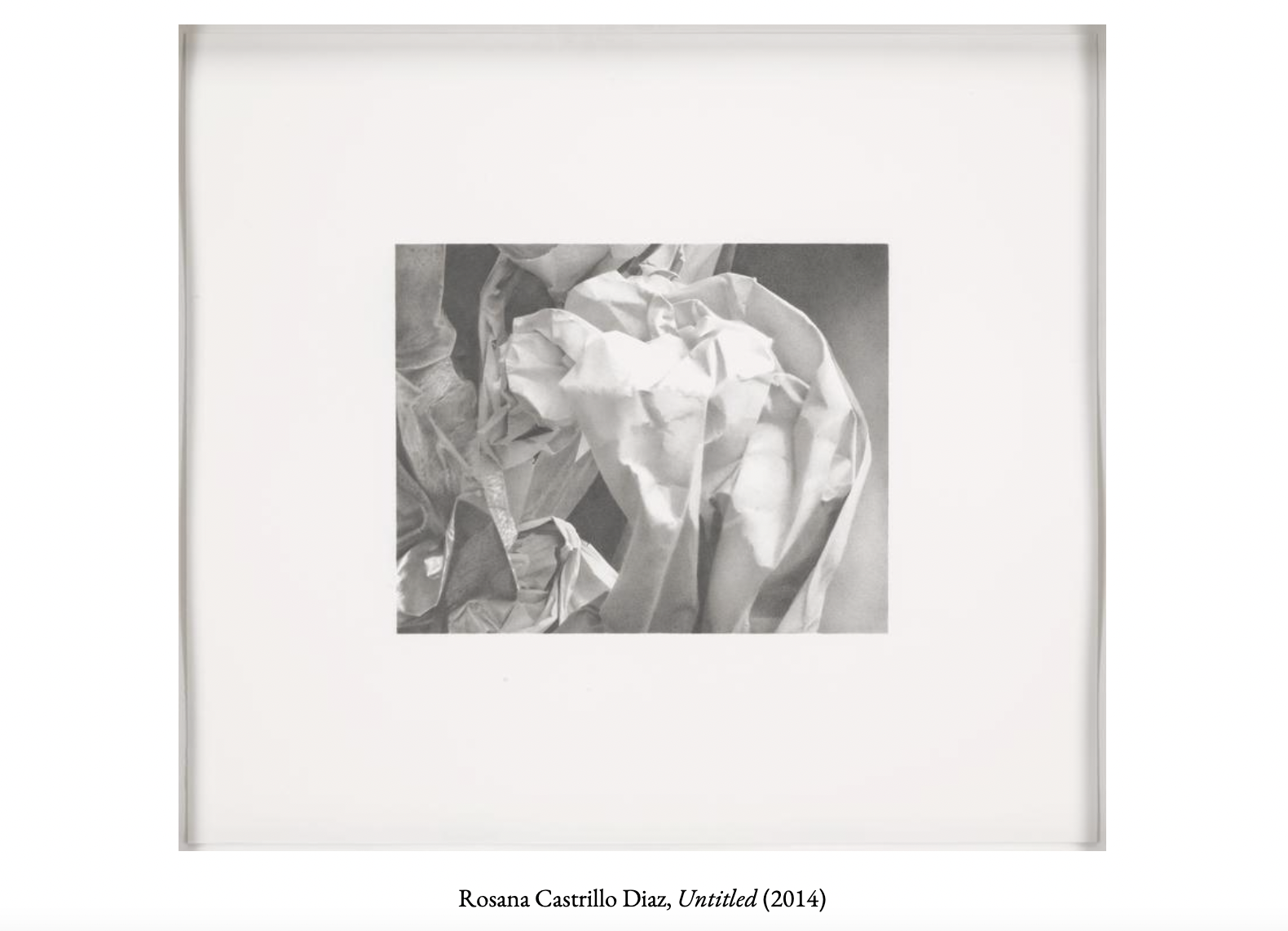 In this graphite still life drawing of crumbled sheets of paper, Rosana Castrillo Diaz reveals a mastery of careful and deliberate observation, belying the apparent simplicity of the work. Her choice of subject is deliberate, reflecting her interest in the ordinary objects of daily life. As she explained of this drawing, “In this body of work, there is a direct connection between memory, emotions, and the physical hand at work. Each mark is a feeling, a chord, each drawing a score witness to a moment in time, a mood, a place. In the silence and introspection engendered, the quietest gesture may very well be the loudest.”