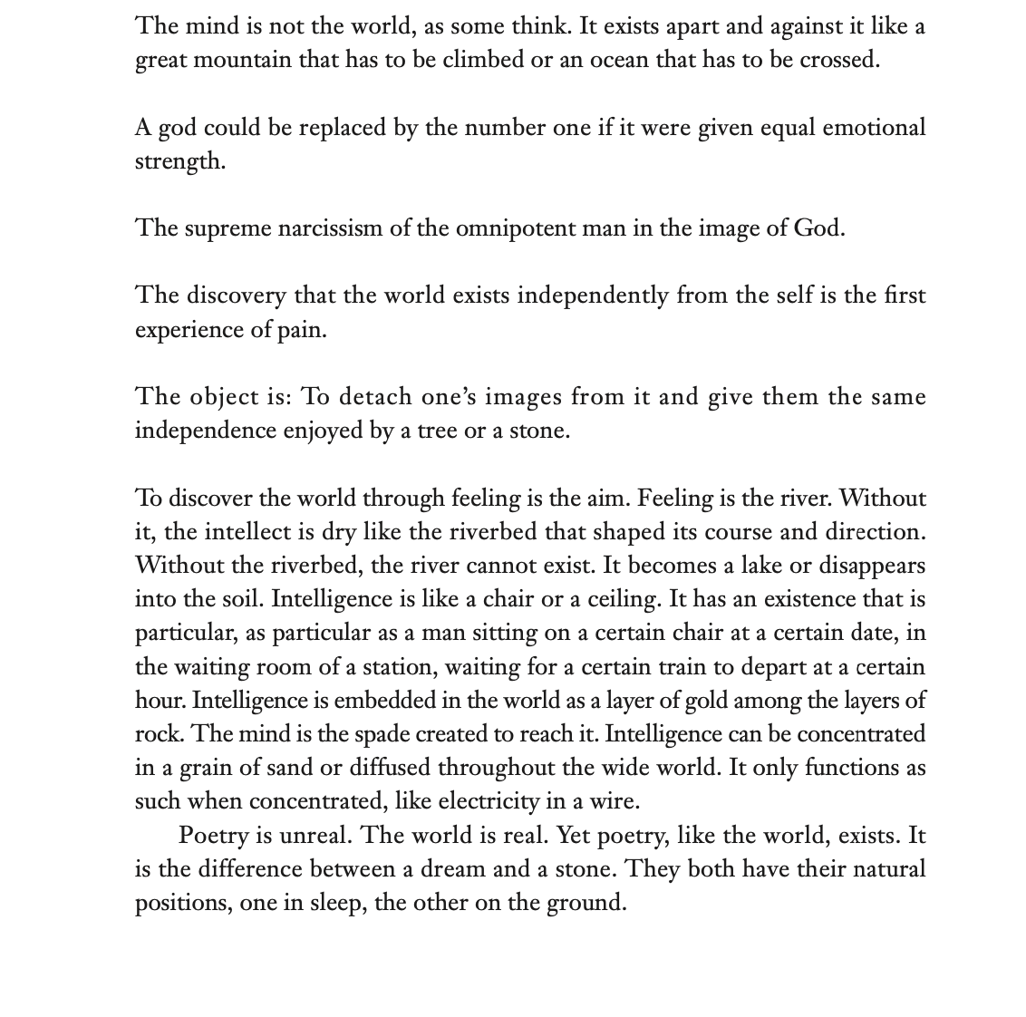 “A metaphysic is first manifested in dreams, a mysterious language of undeciphered signs whose meaning is obscure, dictating our behavior. Then one by one the signs are unveiled to reveal the familiar forms of our experience. Then one still walks in the same forest but knows the names of the trees.”