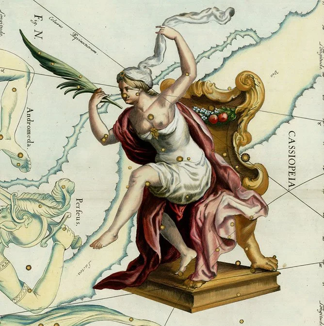 “Upon Cassiopeia’s death, Poseidon placed her in the stars, where she was chained to her throne and must spend half of the year upside-down as further punishment.”