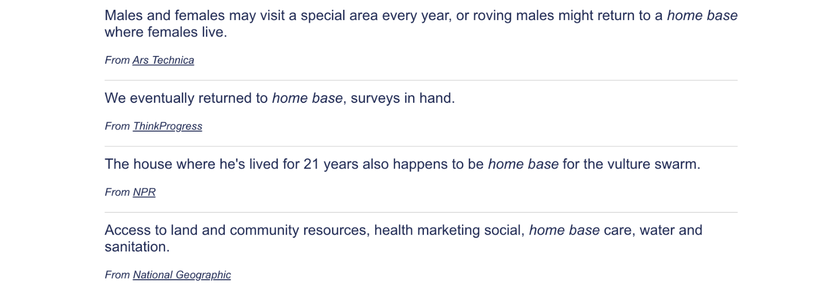 In baseball, “home base” refers to the home plate consisting of a rubber slab where the batter stands; it must be touched by a base runner in order to score.
