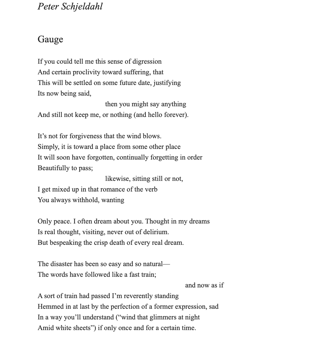 Having pledged my troth to self-division and diversions, I could not very well erase the sort of train passing through Peter Schjeldahl’s “Gauge,” and “the romance of the verb” in the ache of his stanzas, a disaster I bring to this screen where it may apprehend others in their relationship to trains or music or poetry or the revival of “bespeaking” amid the unforgivable beauty of hems and hemmings.