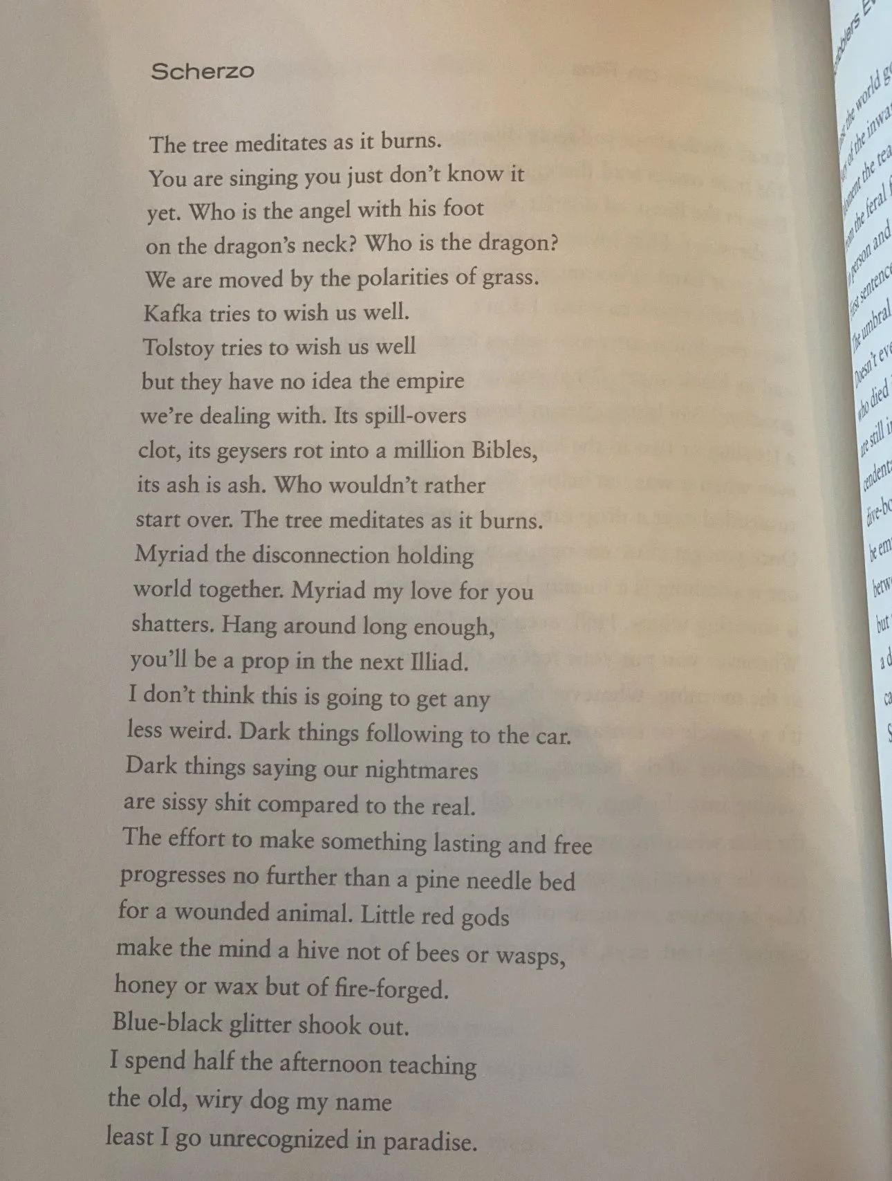 Poetry is no more a thing than fire is; rather it is a conversion that reveals itself in the instance of its occasion. Poetry mitigates just as fire does, by witnessing its own necessary recklessness and senses of the sacred, its ability to combust the ancillary, to grow and make everything itself even as it confronts us with the outcome of its conjugations, with ash, with death.