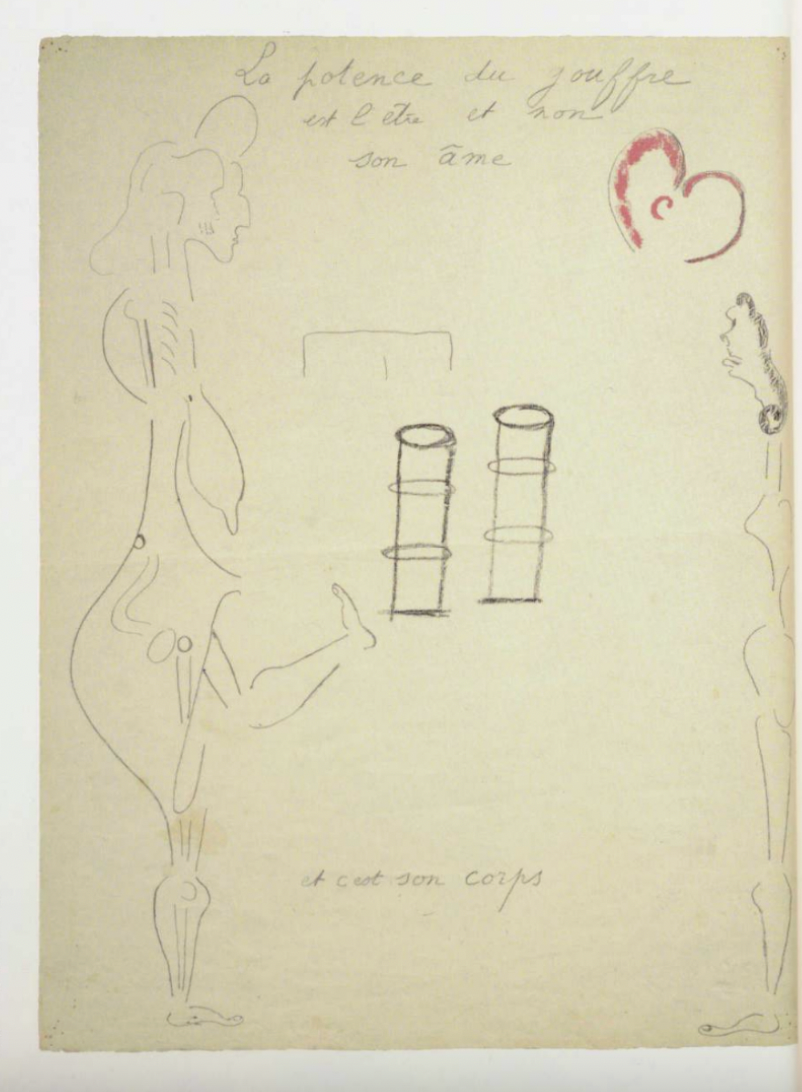 Antonin Artaud's sketch from October 1945. “The gallows for the abyss / is his being and not / his soul / and it is his body.”