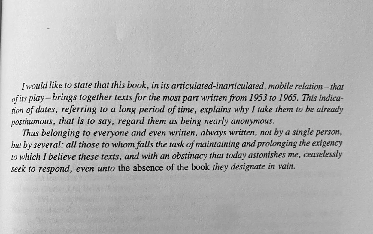 After typing up a bit of it today (while groaning over my terribly tiny handwriting), I dug up my copy of Maurice Blanchot's essay, “The Gaze of Orpheus,” which turns Eurydice into an absence of light waves, rendering her the “profoundly dark point towards which art, desire, death, and the night seem to lead,” dragging her silence into what Christian theologians would mark as “the fortunate loss,” a peculiar sort of metaphysical baggage that continues to haunt various religions as well as theory but also, perhaps, the note at the end of Blanchot’s The Infinite Conversation, which reads: