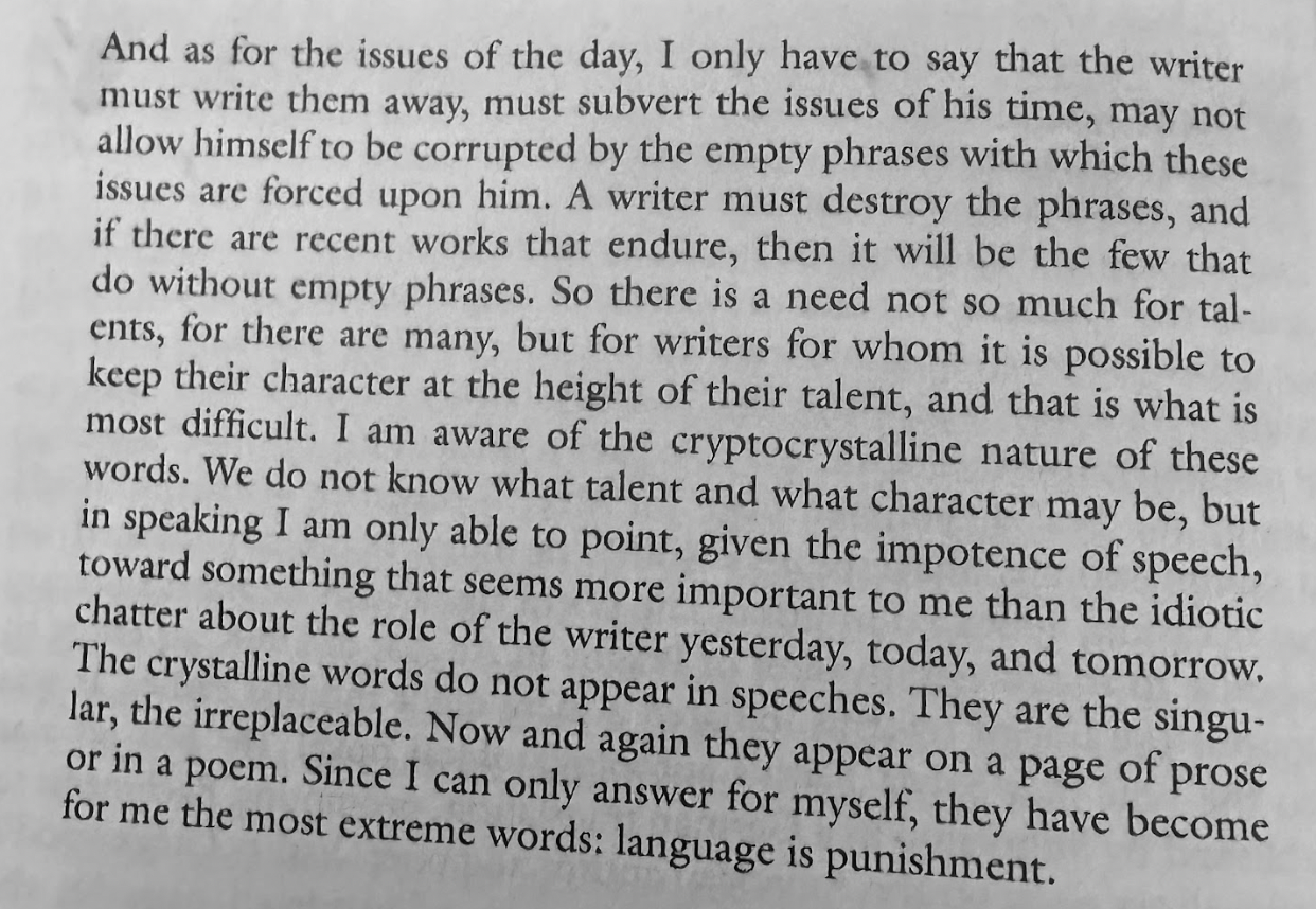 Wandering through Ingeborg Bachmann’s lectures and nonfiction essays has been a solace, even though reading is strange; I begin a sentence and then lose my grip on it. Not even the most voluptuous syntax holds my attention. It’s as if words have lost their teeth. In her bleak acceptance speech for the Anton Wildgans Prize, Bachmann likened the creative process to a loneliness so heavy that it resembles a curse. I quote: