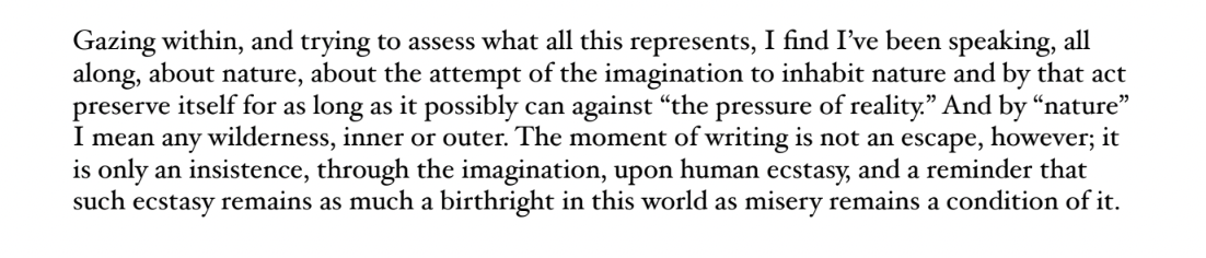 “The moment of writing is not an escape, however; it is only an insistence, through the imagination, upon human ecstasy, and a reminder that such ecstasy remains as much a birthright in this world as misery remains a condition of it.”