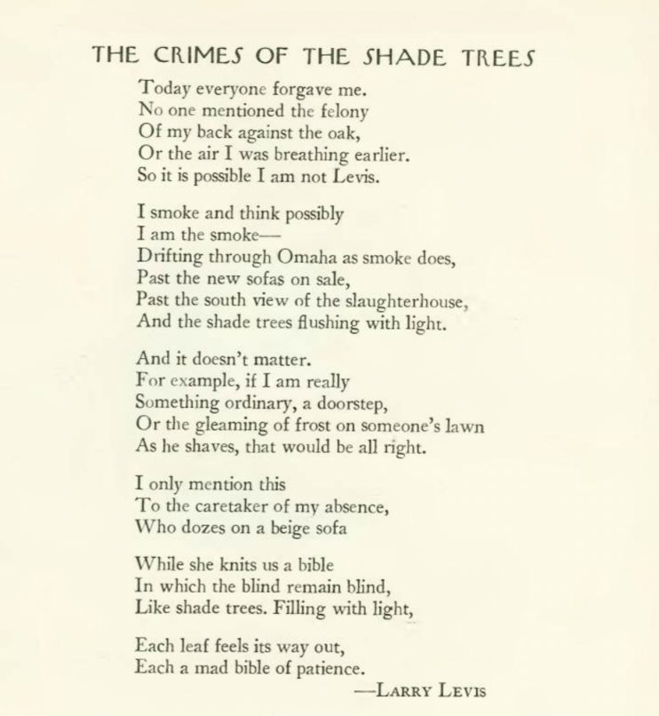 None has been so brazenly “wrong” as Levis in his poems — or so earnest in declaring it. One glimpses his “back against the oak” in “The Crimes of the Shade Trees” . . .