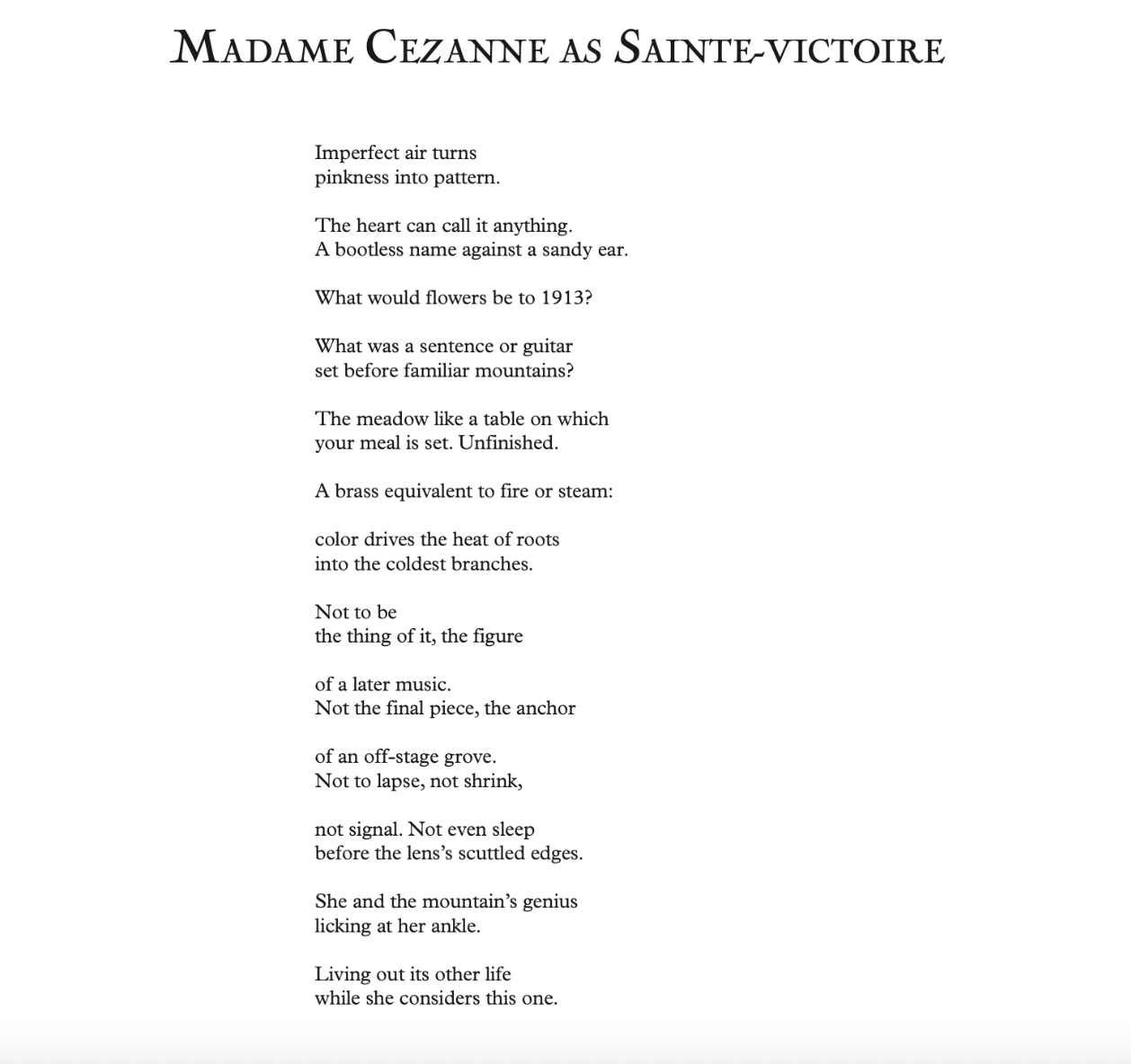 I mentioned Cezanne’s portrait of Hortense earlier —- there is an exquisite poem by Elizabeth Willis that treats “Madame Cezanne” as the mountain Cezanne adored: