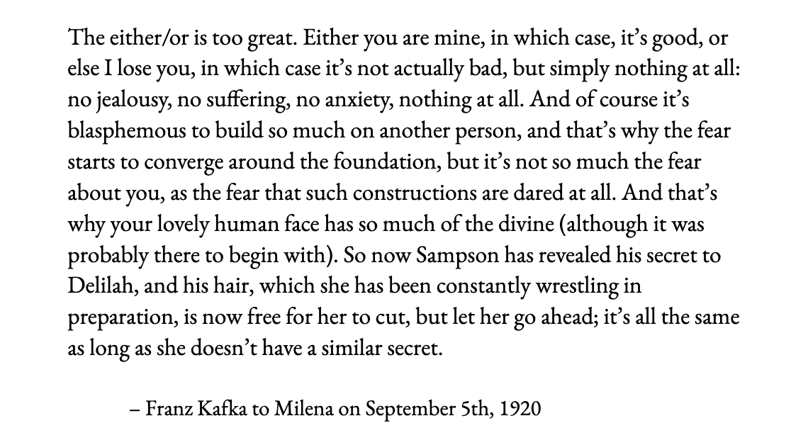 Although Pollack cheated on her constantly, she had given him her “nevertheless” - her partnership - and this unconditionality is what Kafka most craved and refused of the world. There is no way to know the person one is marrying, Milena says. The countless “risks of disappointment” exist from the nature of marriage, and accepting them is critical to relationships. Against “the modern hysteria a la Anna Karenina,” she says, we should see each human as a world unto themselves and accept each other in order to affirm “feeling justified in being” one’s truest, least performative self.