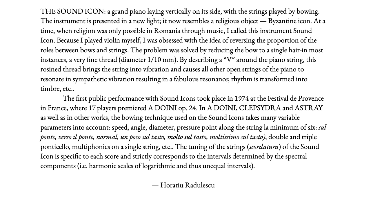 We owe the SOUND ICON to Rădulescu. Essentially, a sound icon is a grand piano turned on its sides and stripped of its mechanics before being retuned and played like a giant resonant harp. The sound icon is played by bowing the strings.