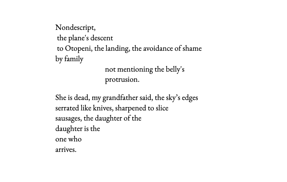 Alone when I learned Bunica had hip surgery after slipping on ice in a Bucharest park. She is fine, a little bored and dehydrated, my grandfather said. I borrowed money for the ticket, packed IV fluids in a suitcase, prepared to tell her of my betrothal to none except the infant in me — the one