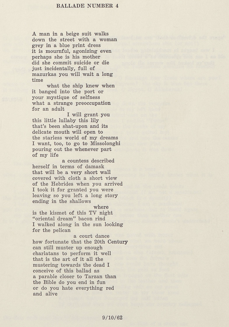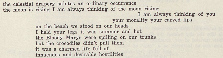 Small motions, often visual . . . as if stanzas were paintings arranged on a gallery wall, interacting with one another relationally. I’m thinking of the tiny couplet-duo diptych O’Hara uses at the end of his page-long poem, “Clytemnestra”, and what he accomplishes by setting his brushstrokes of sadness and longing to the left margin of the page, visually distanced by an open field from the jocular goofiness of the couplet on the right:
