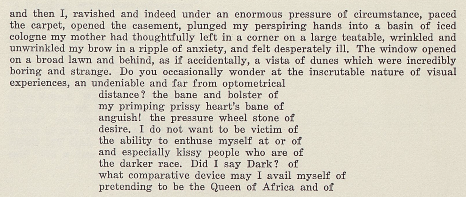 This visual aspect again, in the second part of “Day and Night in 1952” where the end repeat of “of” flares outwards like a peacock tail or a perfect rose-colored fan swishing past a face at the opera: