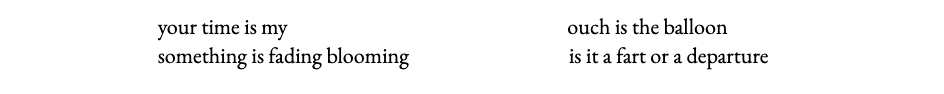 It takes nothing less than a diptych to pull off the wide-open wound — “your time is my ” —- the statement left open, unfinished, expectant, eager to reach across the divide and attach itself to the definitional form granted by “ouch is the balloon.”