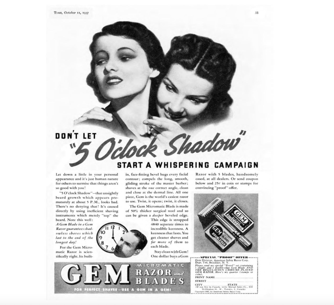 As found in Time Magazine (October 1937), the platform of Henry Luce’s New American Century as well as the medium of communication for empire’s Exceptionalism issues. The target audience for this ad is men and the women who love them. Women, here, are subtly encouraged to shame men into purchasing Gem razors that work more efficiently at reducing the grime of the five o’clock shadow.